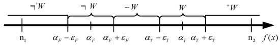 is the distance ratio function [17], and the truth degree value can be obtained from Equation (5), where is the Euclidean distance ( in a one-dimensional case). Taking normalization as an example, according to the truth degree value and Figure 2, it can be seen that when and are in the region, the truth degree value is very small, and the farther away from the region, the lower the normalization degree of data. When is in the ww region, is in the region, and the truth degree value of the data is small, indicating that the normalization degree of the data is low. When is in the ww region, is in the region, and the farther it is from the region, the greater the truth degree value, indicating the higher the normalization degree of data. indicates that the normative degree of data is relatively low; indicates that the normative degree of data is lower than higher. When is in the ww region, is in the region, the degree of truth value of data is large, and the degree of normalization of the data is high. When is in the region, has a very large degree of truth value and a particularly high degree of normalization of the data. Moreover, the farther away from the region, the larger the degree of truth value and the higher the degree of normalization of the data.