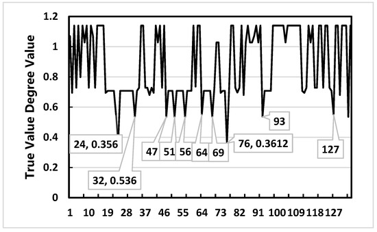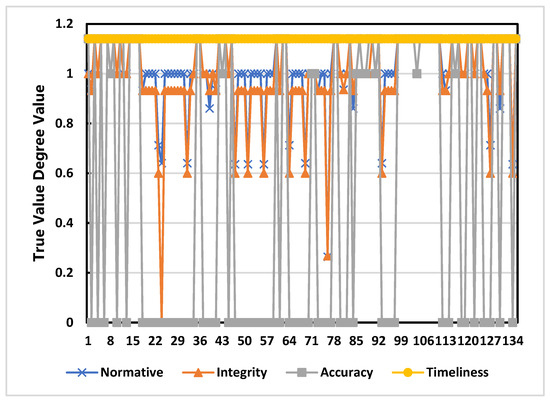 As can be seen in Table 4 and Figure 5, the multidimensional truth value of the 24th structured data is 0.356, with a quality rating of “Level 4”. This is mainly because the attributes “longitude”, “brightness”, “scan”, “track“, and “frp” are incomplete and not accurate to one decimal place, resulting in low normality, completeness, and accuracy of the data. In the process of disaster relief, such data should be discarded to avoid influencing decision-making. At the same time, it also reminds the staff to keep the data complete enough for the next disaster relief. The same is true for the 76th structured data. In addition, the 32nd, 47th, 51st, 56th, 64th, 69th, 93rd, 127th, and 134th data also have a low degree of truth value, and the quality evaluation is “Level 3”. This is mainly due to the fact that some attribute values are partially missing, which lowers the overall data quality. This kind of data should be utilized later, and high-quality data should be used first. At the same time, staff members are reminded that it is very important to record and preserve each attribute of mobile emergency data in strict accordance with the specifications.