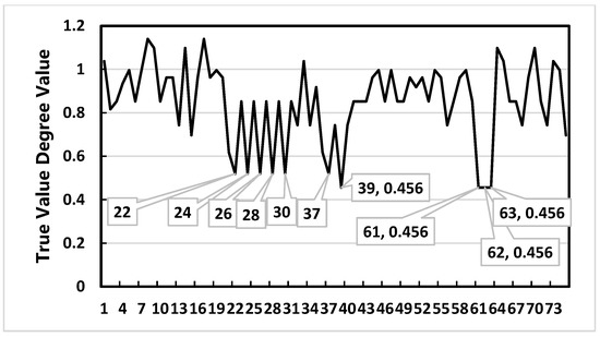 Similar to the norm, the accuracy of the data is judged. For example, if the first data is selected and all attribute values are as follows: , , , , , , , , , , , and . Then the accuracy function value is obtained, which is substituted into Equation (5) to obtain the truth degree of the accuracy of the data, . It means that the degree of accuracy of the data is particularly high, and the quality evaluation is “Level 1”.