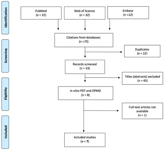 A systematic literature search was performed using a different database (PubMed, the Cochrane Library, and ISI Web of Science) following the PRISMA checklist. The search operations ended on 28 October 2022. The search terms used (MeSH terms) were “(“photodynamic therapy”) AND (“in vitro” OR “cell culture”) AND (“oscc” OR “oral squamous cell carcinoma” OR “opmd” OR “oral potentially malignant disorders” OR “oral pre-cancerous”)”. The flowchart in Figure 1 shows all the results. A structured approach was used to formulate the research question using five components (“PICOS”): the study population (P) consists of dysplastic cell culture treated by topical photodynamic therapy; the intervention (I) was in vitro photodynamic therapy; the comparison (C) was no treatment; the outcome (O) was to assess the results of topical photodynamic therapy in the treatment of pre-malignant and malignant lesions; and the study designs (S) included cross-sectional studies, retrospective cohort studies, prospective comparative studies, case-control studies, case series, and case report. The selection took different steps: after collecting all the initial results, three reviewers (D.D.S., A.L., and A.R.) read the titles and abstracts, excluded duplicates, and ruled out all those articles that did not meet the inclusion criteria during this initial analysis. Then, two reviewers (D.D.S. and A.L.) read the full texts of the remaining articles in depth to better evaluate the content.