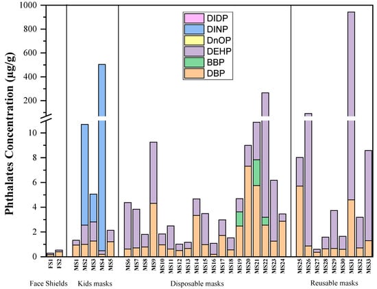 All of the tested face masks and face shields in this study contained quantifiable levels of at least two of the six target phthalates. Reusable cloth masks showed a high total phthalate contents compared with disposable masks. Total phthalate contents were in the range of 0.60–942.60 µg/g. In total, three samples showed a high total phthalate content at the levels of 92.17 µg/g, 503.48 µg/g, and 942.60 µg/g. One of these masks was commercialized for children’s use; this mask contained a high level of phthalates, with a total content of 503.48 µg/g, and DINP was the main plasticizer in this mask at a level of 503 µg/g ± 109 µg/g. The other two masks were reusable masks for adults and contained DEHP as the main phthalate at the levels of 91.3 µg/g ± 111 µg/g and 938 µg/g ± 826 µg/g.