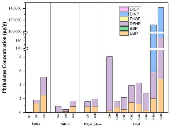 The results in Table 2 and Figure 2 show that only one glove sample had no quantifiable amounts of the target phthalates, while the other 15 samples contained amounts above the LOQ. In all the 16 samples, the analytes BBP, DnOP, and DIDP were not present in quantifiable amounts. In contrast, DBP and DEHP were present in all 15 samples at levels ranging from 0.09 µg/g ± 0.03 µg/g to 4.83 µg/g ± 0.21 µg/g and from 0.29 µg/g ± 0.20 µg/g to 179 µg/g ± 9.1 µg/g, respectively. Large concentrations of DINP were found in two PVC samples (GS15 and GS16), with levels of 111,749 µg/g ± 15,179 µg/g and 141,531 µg/g ± 12,434 µg/g, corresponding with 11.18% (w/w) and 14.15% (w/w), respectively. These two samples also showed the highest levels of DBP and DEHP among the tested samples. The total phthalate contents in the analyzed plastic gloves ranged from <LOQ to as high as 141,714 µg/g (14.17% w/w).