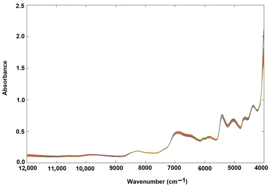 An NIR transflection MPA apparatus (Bruker Optics, Ettlingen Germany) was used to register the infrared spectra of the rice flours. To register the spectrum for each sample, around 5 g of flour was introduced in the specific NIR container and compacted to obtain a similar packing density. NIR spectra were acquired in the range of 12,000–4000 cm−1, with a spectral resolution of 16 cm−1 and 16 scans [9]. The wavenumber range was segmented into 1154 data sets, where each interval represents 6.93 cm−1.
