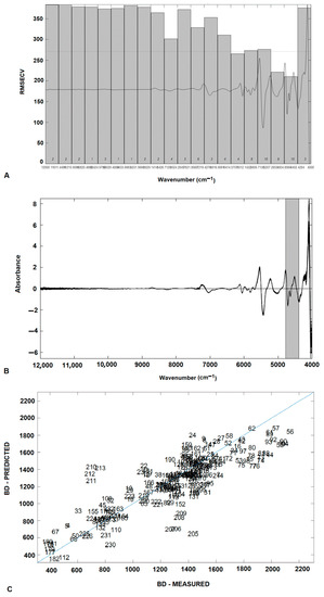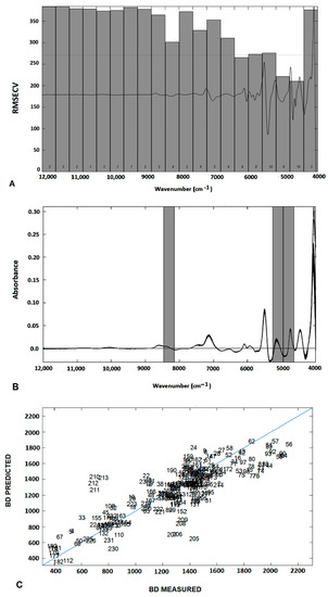 Evaluation of the RMSECV values related to each spectral region. The dotted line represents the RMSECV (10 LVs). Italic numbers represent the optimal number of LVs in each interval model (A). For the siPLS model, specific regions in the NIR spectra present the lowest RMSECV values (B). Correlation between measured and predicted BD values after SNV plus 2nd derivative spectral pre-processing treatment and RMSECV evaluation in several spectral intervals (R = 0.88; RMSECV = 180; 8480–8180 cm−1; 5280–4640 cm−1) (C).