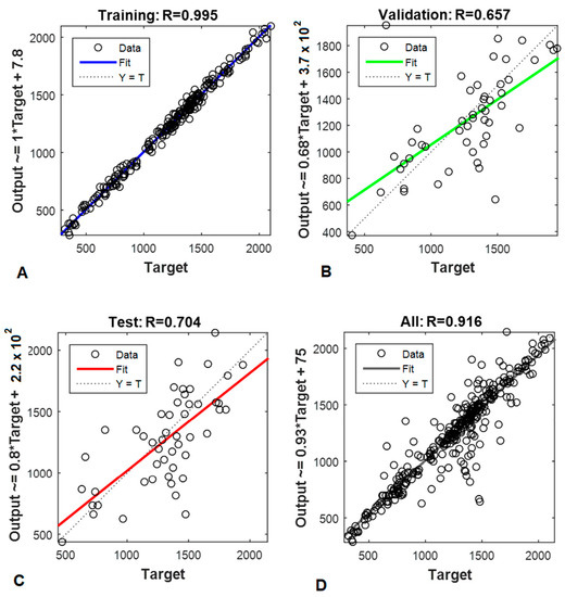 ANN models related to the pasting parameter of breakdown: calibration step (A); test set (B); validation (C); all processes (D).