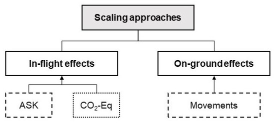 First, the traffic-size-related scaling is performed to consider effects from different flight frequencies, aircraft types and the associated fuel consumption as well as CO 2 effects. This effect is modeled with the ASK-related scaling factor a calculated as