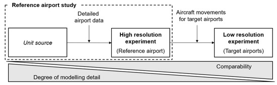Figure 3 schematically illustrates the generalization strategy adopted by the ground-related OIs with three levels of generalization, including the associated modeling detail and comparability levels. Within the detailed assessment per reference airport, the emissions are estimated for a unit source, which can, for instance, be represented by different aircraft, ground vehicles, or building types. In a second step of the reference airport study, this specific data per unit source is generalized to the implementation of the OI at the considered reference airport, e.g., based on the aircraft operating at this airport or the respective ground vehicle fleet. To scale the OI results obtained for a reference airport to the target airports, the number of flight operations at the airports is used as a proxy to scale fuel and energy consumption as well as corresponding emissions. On this basis, ATR100 as the selected climate metric can be assessed.