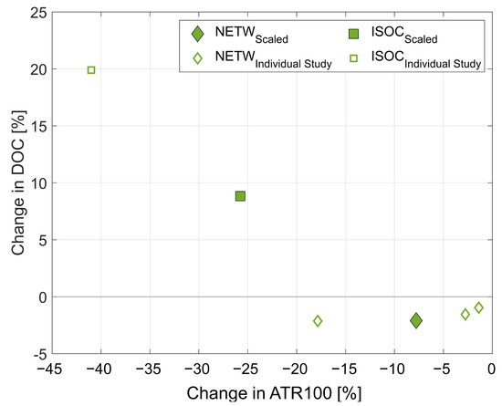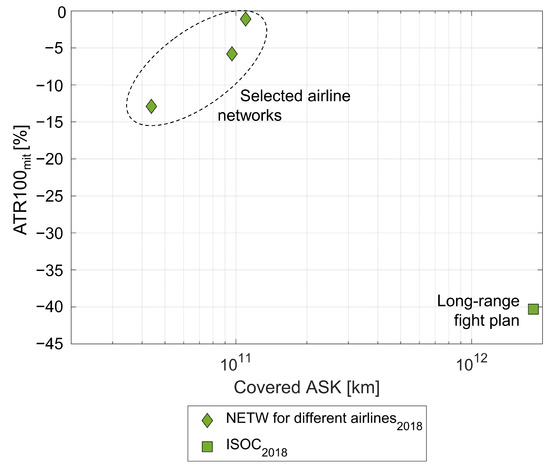 The network optimization including climate effects as performed in the OI NETW shows mitigation potentials between 1 and 13% in ATR100 for the different selected representative airlines. This is associated with a drop in profit of up to 7% on an airline level, although DOC even decreases marginally. Observed network changes are primarily characterized by flying on shorter routes rather than medium or long-haul missions [31,71]. Furthermore, ISOC study results show that implementation of climate-optimized ISO on the network of European long-haul flights comes with a climate mitigation potential of approximately 40% in ATR100 for the considered flight plan. Nevertheless, flight time and fuel consumption increase significantly due to additional starts and landings, detours to reach the required refueling airport as well as a reduction of flight altitudes, which yields a DOC rise of 20.9% [20].