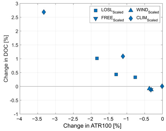Trajectory-related OIs have been investigated by incorporating day-specific weather situations and atmospheric boundary conditions for one to four selected representative days. As only one comparable representative day is considered in all four studies, the detailed comparison is thus limited to this day. The target flight plan is defined by all flights originating or departing from the ECAC area performed with Airbus or Boeing passenger aircraft and with a distance of at least 500 km. This covers 25.3% of the global flight plan ASK on the selected day and 87.8% of all European flights. Reference flight plans vary significantly for the individual studies (see Appendix A). KPIs of the comparison are set to F-ATR100, which is derived from ATR20 by applying conversion factors determined in Dietmüller et al. [67], and DOC. Since the considered mission adjustments are limited to the flight itself without changing aircraft assignments or OD pairs, we assume that passenger capacities and ticket prices do not change with the OI implementation. The scaling is performed as follows: Based on the measure-specific reference flight plan, climate mitigation potentials in terms of ATR100 are scaled to the target flight plan of the selected representative day. CO 2 -Eqs for the selected representative day are estimated with algorithmic climate change functions (aCCFs) [67,68], which have been assessed for the full target flight plan. On this basis, different application scopes of the investigated OIs can be modeled, e.g., an application of LOSL for all long-range flights to or from the ECAC area or an application of CLIM for North Atlantic flights only. However, an implementation of LOSL is assumed to be suitable for long-distance flights only as shorter Intra-European missions are typically performed at lower flight altitudes and are expected to be addressed by optimized routing concepts as covered by the OIs FREE and WIND. Resulting changes in DOC are scaled based on the traffic size, namely ASK.