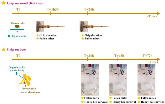 - Vilarem, C.; Piou, V.; Blanchard, S.; Armengaud, C.; Vogelweith, F.; Vétillard, A. Lactic Acid Impairs Varroa destructor Grip Skill: Effects on Its Biology and Behaviour under Artificial Conditions. 2023; under review. [Google Scholar]