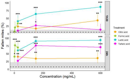 | Acids | Conditions | (A) Percentages of Fallen Mites | (B) Median Grip Duration | ||