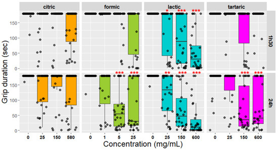 Chicago/Turabian StyleVilarem, Caroline, Vincent Piou, Solène Blanchard, Fanny Vogelweith, and Angélique Vétillard. 2023. "Lose Your Grip: Challenging Varroa destructor Host Attachment with Tartaric, Lactic, Formic, and Citric Acids" Applied Sciences 13, no. 16: 9085. https://doi.org/10.3390/app13169085