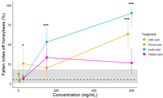 3.2. Effect of Organic Acids on V. destructor Fall off Honeybees
