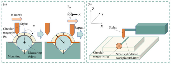 As shown in Figure 1a, a small cylindrical workpiece with a diameter of 1.5 mm and length of 7.8 mm is attached to the circular magnetic jig, which is marked by eight equal lines on the surface. This kind of combination is mounted on the V-groove. As shown in Figure 1b, the stylus of the profilometer is brought to scan on the surface of the small cylindrical workpiece and returned to the initial position, after which the first arc coordinate data can be obtained. The small cylindrical workpiece is rotated by 45° by rotating the circular magnetic jig by one equal part. The stylus scans on the surface of the workpiece again and returns, then the second set of arc coordinate data can be obtained. We repeat the procedure seven times, then eight sets of arc coordinate data can be obtained. Since the maximum measuring inclination of the stylus is ±45°, only 85° arc coordinate data are extracted for the following data processing.