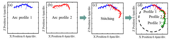 The eight arc profiles with respect to the arc coordinate can be characterized by a series of data processes. An inaccurate roundness profile can be formed by stitching these eight arc profiles together. Regarding the stitching procedure, as shown in Figure 2a,b, arc profiles 1 and 2 are at the initial position. As shown in Figure 2c, the first arc profile is kept static and the second arc profile is rotated by 45°, since there is a 45° angular displacement between adjacent arc profiles according to the measuring procedure. As shown in Figure 2d, the second arc profile is kept static, and the third arc profile is rotated by 45°, while the rest of the arc profiles are stitched in this manner. However, there are some stitching angle errors between adjacent arc profiles, since the small cylindrical workpiece is rotated manually, namely, the angular displacement between adjacent arc profiles is not always 45°. Therefore, stitching angle error compensation is necessary. An accurate, integral, smooth, continuous roundness profile can be obtained after stitching error compensation, overlap part combination, and low-pass filtering.