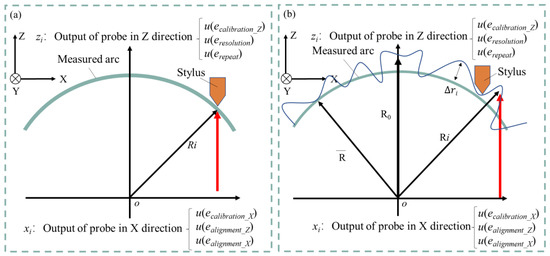 The uncertainty of roundness and diameter measurements of a small cylinder with a diameter of 1.5 mm and length of 7.8 mm by the stitching linear scan method is carried out at first. Mathematical modelling was conducted to calculate the measurement uncertainty of the diameter and roundness. The arc coordinate (xi, zi) in the rectangular coordinate system can be obtained by a profilometer with its stylus. The mathematical model used for radius calculation and the uncertainty factors deriving from the measurements are shown in Figure 3a. The radius of each arc can be fitted by the least square method. Radius Ri of an arbitrary measuring point can be expressed by Equation (1), where (xi, zi) is the arc coordinate.