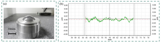 The calibration of the employed Form Talysurf PGI420 is conducted with the dedicated master sphere shown in Figure 4a. The Pt value, which is the minimum and maximum width after linear expansion of the arc measured at the known radius values shown in Figure 4b, includes the shape error of the master ball, the shape error of the stylus tip diameter, the electrical noise of the system, and mechanical and environmental disturbances. The Pt value = 0.0337 μm exists in the radial direction, but assuming that it exists in the Z-axis direction and the X-axis direction, respectively, the uncertainty of the probe calibration in the Z-axis direction can be expressed by the following equation.