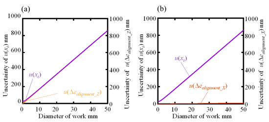 Variation of u(xi) in accordance with the diameter of workpiece: (a) influence of u(Δealignment_Z); (b) influence of u(Δealignment_X).