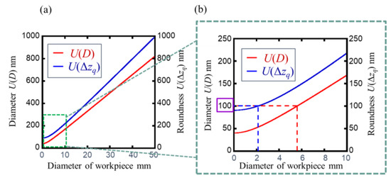 (a) Variation in U(D) with the diameter of the workpiece; (b) variation in U(Δzq) in accordance with the diameter of workpiece.