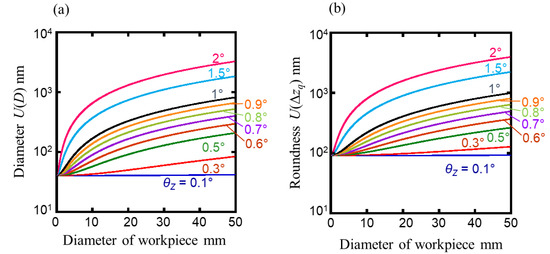 Variation of U(D) and U(Δzq) in accordance with diameter of workpiece: (a) diameter ф 0.01–50 mm; (b) diameter ф 0.01–10 mm.