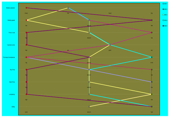 Figure 8 illustrates the initial parameters used to evaluate all proposed alternatives in this study. The cost of purchasing welding and maintenance machines is presented relative to the average value of comparable features. Specifically, WM 1 represents a compact welding machine utilizing MIG welding technology, offering diverse capabilities. On the other hand, WM 2 showcases a medium-sized welding machine using Flux-Cored Arc Welding (FCAW). WM 3 denotes a welding machine that can be easily transformed into an arc welding machine. Additionally, WM 4 and WM 5 correspond to the TIG and laser welding machines, respectively. As depicted in Figure 8, the laser machine is the most expensive option, while the costs of WM 1 and WM 2 are the most economical.