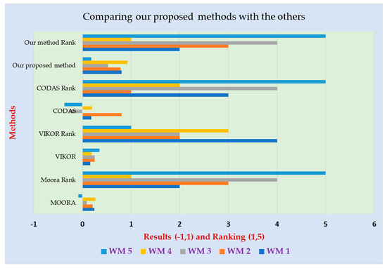 - WM5: MOORA rank—5; VIKOR rank—1; CODAS rank—5; our proposed method rank—5 (total score: 5 + 1 + 5 + 5 = 16).