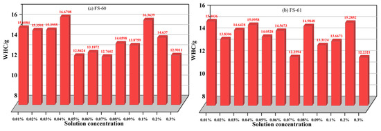 As can be seen in Figure 4b, there is no clear pattern in the weight loss of the FS-61 solution at different concentrations. The maximum weight loss of 15.4036 g occurred at a mass fraction of 0.01%, while the minimum weight loss of 12.2321 g occurred at a mass fraction of 0.3%, resulting in an extreme difference of 3.1715 g. When comparing the difference between adjacent concentrations, the maximum increase of 2.7254 g was observed between 0.07% and 0.08%, while the maximum decrease of 3.0531 g occurred between 0.2% and 0.3%. These findings suggest that water retention was strongest at 0.3%, followed by 0.07%, and weakest at 0.04%. The differences in weight loss between adjacent concentrations vary, suggesting that the water retention capabilities of the FS-61 solution are not consistent across concentrations.