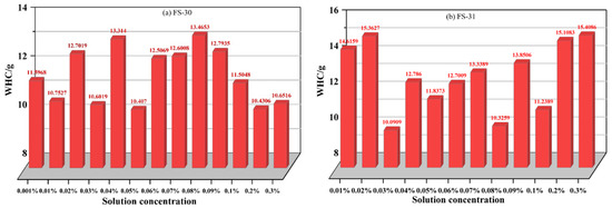 The results presented in Figure 6a indicate that the water loss of the FS-30 solution at varying concentrations is not uniform across different time periods. However, the overall water loss at 60 h does not exhibit a significant change with an increase in concentration. The solution with the lowest concentration of 0.05% demonstrates the least total water loss (approximately 10.4070 g), with an average water loss rate of 0.17345 g/h. The 0.2%-concentration solution has the second-lowest total water loss (approximately 10.4306 g) and an average water loss rate of 0.17384 g/h. These observations suggest that the presence of specific molecular functional groups in the solutions may favorably interact with water molecules, leading to lower water loss. The analysis of water loss in different time periods also reveals that the periods 0–12 h and 24–36 h have higher water loss than 48–60 h. The specific concentrations associated with the lowest water loss in each time period (0–12 h, 12–24 h, 24–36 h, 36–48 h, and 48–60 h) highlight the potential influence of specific molecular functional groups on water retention at different stages. The interactions between these functional groups and water molecules, such as hydrogen bonding or hydrophilic–hydrophobic interactions, can affect the stability and evaporation rate of the solution. Based on a comprehensive analysis, the optimal concentration of the FS-30 solution for water retention is found to be 0.2%.