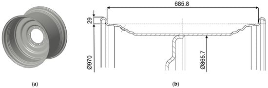 An example of an off-highway wheel is represented in Figure 2a, while the rim specifically analyzed in this paper is represented in Figure 2b. Its denomination is TW27×38″, where numbers 27 and 38 indicate, respectively, the rim width and the rim nominal diameter in inches, while the term TW identifies the geometry of the profile section.