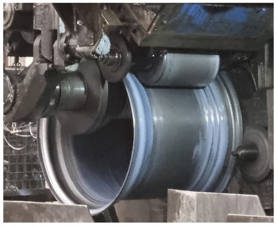 In this case, the cold roll forming is made in two steps, and it is the operation that most affects the area under investigation. In fact, the roll forming gives the final shape to the rim section profile, inducing local plastic deformation and material thinning, especially in the correspondence of the section radii. It may also change the surface condition of the base material from the point of view of roughness and residual stress state. This aspect is treated in Section 3.3, while an example of the rolling operation is shown in Figure 3. The rim was e-coated by a cataphoresis process to its final surface finish.