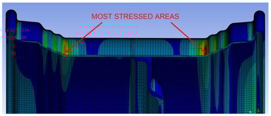 The rim size TW27×38″ is mostly used in agricultural applications, such as harvesters and high-power tractors, coupled with tyres of radial design. In these working conditions, it is known, from the experience of wheel manufacturers, that the most stressed point of the rim is the radius next to the rim vertical center line. This is highlighted in a typical FEA result shown in Figure 4. For that FEA, the software used was Ansys Workbench 2022. A simplified symmetrical model of the wheel was developed to save computational time. The finite element model was composed of a total number of 81,330 hexahedral elements and 446,815 nodes. A static linear elastic analysis was conducted, using a general structural steel as a material model, with mechanical properties according to Table 2 and Poisson’s ratio ν = 0.3. A fixed support boundary condition was applied to the surface of the disc that is bolted to the hub of the machine. The wheel model was subjected to the combined action of tyre pressure and radial load.