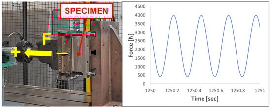 The fatigue tests were conducted in load control mode at 4 Hz frequency, with load ratio R = Fmin/Fmax = 0.1 and a sinusoidal load function. These parameters were chosen to optimize the test machine behavior from the point of view of dynamics and oil temperature control. An example of the load function is shown in Figure 6. An additional strain gauge was applied on each specimen, in the area of maximum stress, to acquire the actual strain value, ε, during the fatigue test. The strain gauges used were Micro Measurements (Wendell, NC, USA) WK-06-125BT-350, with a gauge factor of 2.01. A change in the behavior of the strain range, Δε = εmax − εmin, from steady to continuously increasing values, was considered the signal of fatigue crack development, as will be discussed in Section 3.1. In the absence of this trend, tests were conducted up to 2 × 106 cycles, considered as a limit to runout. At the end of the test, each specimen was submitted to magnetic particle inspection to confirm the fatigue crack development.