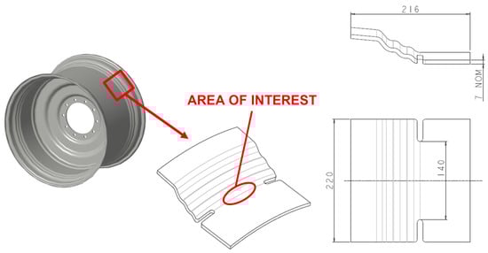 Off-highway wheels are usually made of two main components that are welded together: the rim, which is the part directly in contact with the tyre, and the disc, which is the part connected to the hub of the machine through bolts. Although this study is focused on the rim component, a similar procedure could be applied to the disc, as in [,], to the welding joint between rim and disc, or extended to other structural components.
