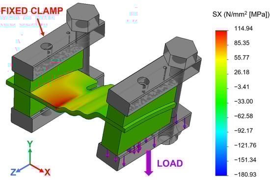 The shape optimization resulted in the introduction of a notch at both sides of the specimen, near the radius under investigation, as shown in Figure 7. It is important to notice that, given the load conditions and the curved geometry of the specimen, the notch acts as a stress raiser only for the central part of the remaining section and not at the root of the notch itself. This is an essential difference, if compared to standard fatigue tests of notched specimens. The optimization study focused on two parameters of the notch geometry: the notch length and the notch radius. The notch length was optimized to reduce the specimen cross-section, thus increasing the stress in the area of interest without affecting the test machine setup. In fact, the stiffness of the specimen had to be sufficient to allow proper test loads in the sensitivity range of the machine. The notch radius was optimized to not create the maximum stress peak at the root of the notch itself, thus avoiding an undesired failure mode. As a final result, considering the maximum principal stress along the axial direction of the specimen (x, in Figure 8), the stress ratio between the radius under investigation and the region next to the fixed clamp, where the bending moment is maximum, was 1.53. Therefore, the probability of obtaining the specimen failure where needed, for the test purpose, was maximized, as later confirmed by the fatigue test results, discussed in Section 3.1.