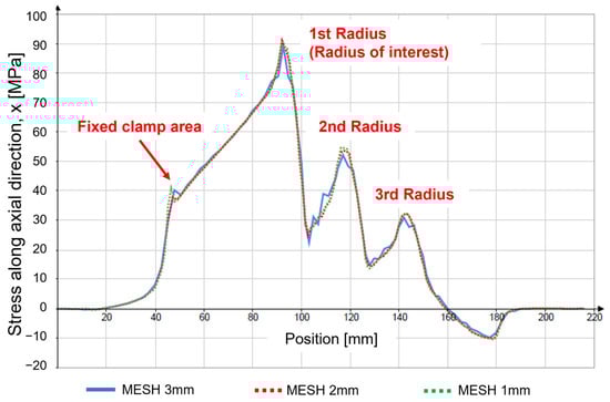 The contact condition between the clamps and the specimen surface was simulated using a frictional coefficient of 0.3 and a proper preload was applied to the connection bolts. Parabolic solid elements, with 16 integration points, were used for the mesh generation. A 2 mm mesh size was used, resulting in a total number of 455,986 elements and 670,942 nodes. The mesh size was chosen after a preliminary sensitivity analysis, the results of which are shown in Figure 9. The comparison between three different mesh sizes showed a maximum difference below 3% in the stress distribution along the specimen axial direction. The choice of the final mesh size allowed us to optimize the overall computational time without influencing the accuracy of the result.
