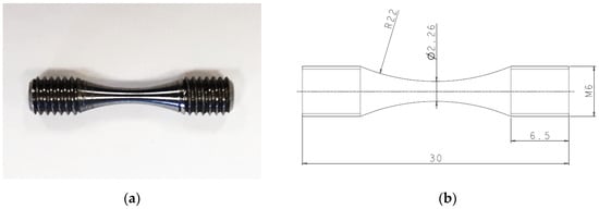 Geometry of the specimens used for uniaxial fatigue testing (a), with specified dimensions in unit [mm] (b).