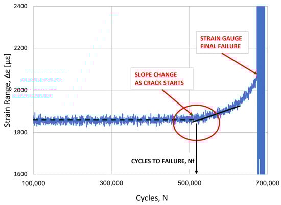 A total number of 24 specimens were tested according to the procedure presented in Section 2.2.1. All the failed specimens showed a fatigue crack development in the radius under investigation, thus confirming the appropriateness of the specimen geometry studied by FEA. As a failure criterion, the change in the slope of the strain range, Δε, was assumed, with reference to a graph where the strain range behavior is monitored versus the total number of load cycles, N. In the presence of a fatigue crack, in fact, the strain range value starts to increase noticeably, leading to the strain gauge failure when the crack path reaches the strain gauge grid, which is narrower than the area of the specimen subjected to the maximum stress. An example of the typical behavior indicating the nucleation and development of a fatigue crack in the rim section specimens is shown in Figure 12, where the strain range, Δε, is represented in microstrain units [µε]. The number of cycles to failure, Nf, was assumed as the value by the slope change.
