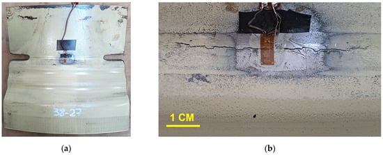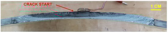 When the failure criterion of the specimen was met, the test was stopped, and the actual presence of a fatigue crack was confirmed by magnetic particle inspection. An example of a detected fatigue crack is shown in Figure 13. The crack originated exactly in the desired point, confirming the development path that is usually found in the case of rim failures in service [].