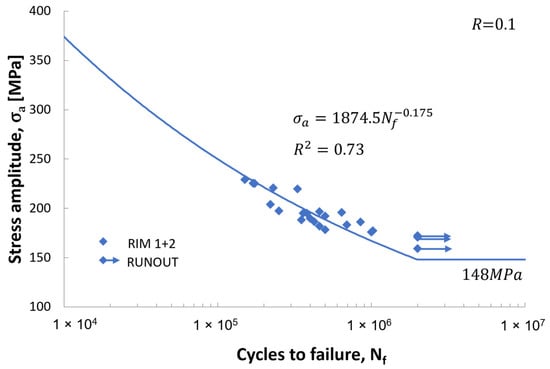 The specimens tested were obtained from two different rims of the same production batch, not manufactured consecutively but at a certain time interval. Henceforth, they will be referred to as Rim 1 and Rim 2. First, the aggregated fatigue data of both rims were considered to obtain the S-N (stress-life) diagram for the component at 50% probability of survival. The fatigue curve of the finite life region was obtained by linear regression of the fatigue data. It is represented in Figure 15, in terms of stress amplitude, , versus cycles to failure, Nf. The horizontal line of the graph represents the fatigue strength at runout (2 × 106 cycles) for tension–tension bending tests with load ratio R = 0.1. Since it refers to the stress amplitude, it will be named as throughout this paper. From the analysis of the aggregated data of Rim 1 and Rim 2, = 148 MPa.