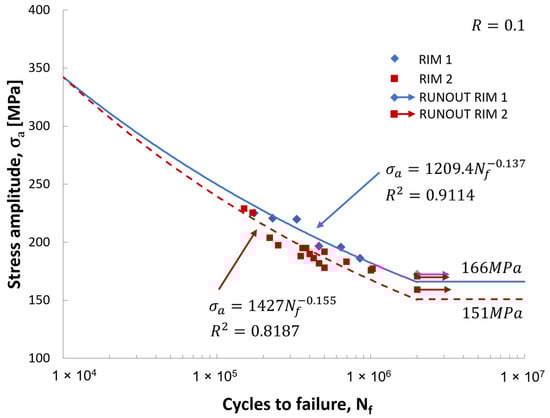 The correlation factor of the finite life part of the S-N curve is R2 = 0.73, thus indicating a certain scatter of the data. For that reason, the same analysis of the fatigue data was then repeated, considering the specimens from Rim 1 and Rim 2 separately. The comparison is shown in Figure 16. In general, the fatigue life results are better for Rim 1 than for Rim 2. The recalculated fatigue strength at runout is = 166 MPa for Rim 1 and = 151 MPa for Rim 2. It must be noted that the number of specimens used from Rim 1 was limited to seven, therefore these data allow just for preliminary and exploratory research, according to ASTM E739-23 []. However, this trend was quite clear during the development of the tests and may indicate that the rolling process parameters changed between the manufacturing of Rim 1 and Rim 2. Just a few seconds difference in the rolling time of the components could locally induce a change in the characteristics of the material. That aspect needs to be confirmed by further investigation as a future development of this study.