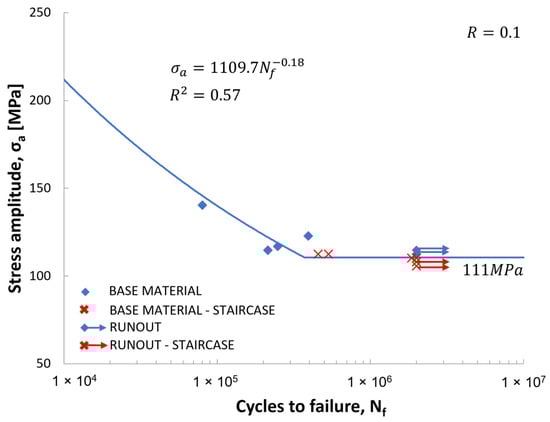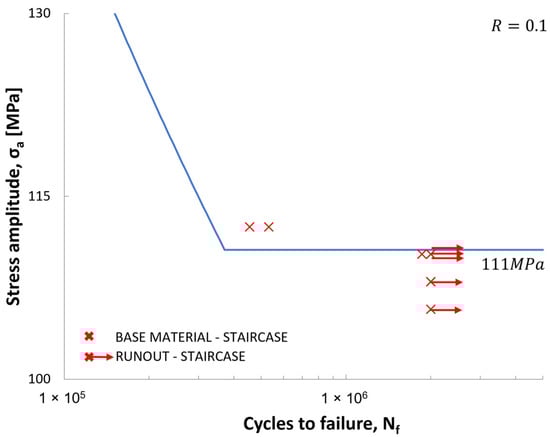 To investigate further this topic, standard fatigue tests were run on the base material of the rim, with the test setup and the specimen geometry presented in Section 2.2.3 and Section 2.2.4. Fourteen hourglass specimens were obtained from a strip of the material before the rim production process. They were oriented in the transverse direction of the strip (T), which is the direction of the maximum principal stress both in actual rim service condition and in rim section fatigue testing. Given the possibility of using a high-frequency test machine, special attention was paid to the fatigue strength at 2 × 106 cycles, which was investigated by a methodology based on the staircase method (UNI 3964 and JSME standard []). Six specimens were available, in this preliminary analysis, for the finite life region of the S-N curve, which should only be considered as approximate. As a failure criterion, the complete break of the specimen in two parts was assumed.