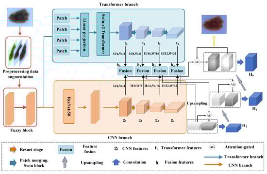 As shown in Figure 1, FuzzyTransNet mainly consists of three parts: (1) A fuzzy preprocessing module in which we propose a new preprocessing approach to address the issues of blurry boundaries and imaging problems in medical images. This approach is applied to the input layer of the network. (2) ResNet50 and Swin Transformer V2 are chosen as the two branches for obtaining local and global features. The multi-level features extracted from both branches are then fed into the fusion module, allowing for effective integration. (3) An attention-gated (AG) network [16] and skip connection are used to combine the features output from each fusion module to generate the final segmentation result.
