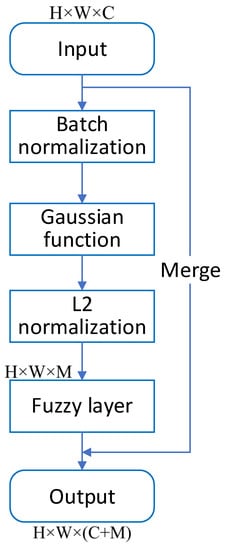 The fuzzy block structure is shown in Figure 2. In the fuzzy layer, a feature map is input with dimensions (N, H, W, C), and the number of original image categories is M. In order to calculate the Gaussian function, the two-dimensional pixel value in the feature map needs to be changed to one-dimensional data (H × W) through the Gaussian membership function to calculate the degree of certainty that each pixel value belongs to the lesion area. Since the output value of the Gaussian function varies over a wide range, the L2 regularization method is used to process it so that it can be normalized to a value range similar to the distribution of the original input data. After the fuzzy layer outputs the fuzzy logic uncertainty value with dimensions (N, H, W, M), it can affect the distribution of the pixel value information in the feature map. Finally, the uncertainty value and the original input are fused into a feature map with dimensions (N, H, W, C + M) and then output to the neural network for subsequent operations.