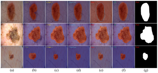 Comparison of representative skin lesion segmentation results. (a) Original image. (b) Results of U-Net. (c) Results of U-Net++. (d) Results of TransFuse. (e) Results of our method. (f) Ground truth. (g) Segmentation results generated by our method (grayscale).
