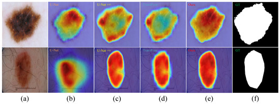 To further evaluate the effectiveness and robustness of our proposed FuzzyTransNet method, this paper conducted visual comparative experiments on representative images from both polyp and skin lesion datasets. Given the frequent oversight of polyps in routine colonoscopy examinations, with miss rates ranging from 14% to 30%, we selected two highly representative polyp samples closely adhering to tissue surfaces in Figure 7. In the original images, the color of polyps is often indistinct from that of the surrounding tissues. By observing the results in the second row, it can be stated that the segmentation outcomes of our proposed algorithm exhibit greater similarity to the ground truth compared to the other algorithms. Moreover, we employed the GradCAM (gradient-weighted class activation mapping) [37] visualization method to intuitively discern where each model concentrates its attention in lesion areas, particularly for polyps that may dangle or adhere closely to tissue surfaces. In Figure 8, it is evident that FuzzyTransNet focuses more comprehensively on lesion regions compared to the other models.