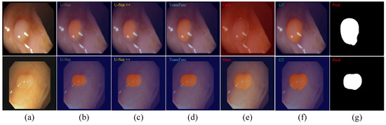 Comparison of representative polyp segmentation results. (a) Original image. (b) Results of U-Net. (c) Results of U-Net++. (d) Results of TransFuse. (e) Results of our method. (f) Ground truth. (g) Segmentation results generated by our method (grayscale).