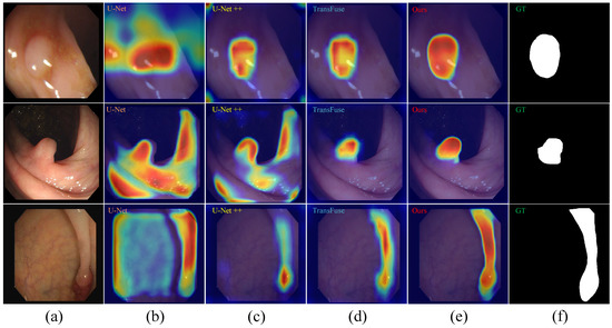Comparison of the CAMs obtained using the representative algorithms. (a) Original image. (b) CAMs generated by U-Net. (c) CAMs generated by U-Net++. (d) CAMs generated by TransFuse. (e) CAMs generated by our method. (f) Ground truth.