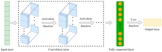 The basic structure of the CNN model usually includes an input layer, convolution layers, a fully connected layer, and an output layer. The input data were transferred through a series of layers (three convolution layers, activation function, and loss function). Finally, the mapping calculation obtained the amplification factor. Specifically, the input of the 1D CNN was either a 1 × N or an N × 1 array. As shown in Figure 3, an N × 1 array was passed through a series of convolution layers and the fully connected layer. Then, the amplification factors for the local ground motion were obtained in the output layer.