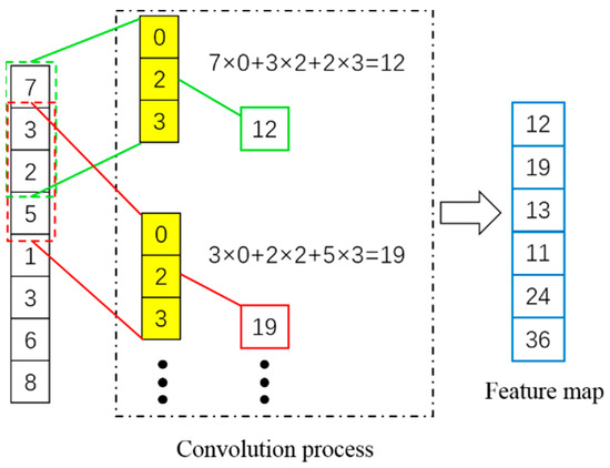 The function of the convolution layers was to extract features from the input data. As shown in Figure 4, the convolution process was to multiply each element in the convolution kernel (e.g., yellow box) by the corresponding element in a subregion (e.g., green or red dotted box) of the convolution layer input data, and summing the products to obtain an element in the feature map. Each time, the sub-region was moved down by one step, and the process was repeated until all elements of the input data were involved. Finally, the convolution operation formed a new array (i.e., the feature map).