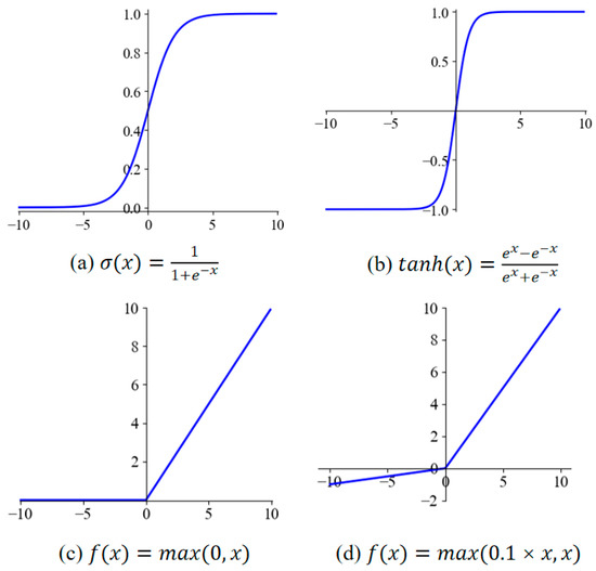 The activation function introduces nonlinearity so that the CNN can approximate any nonlinear function arbitrarily to achieve better learning capabilities [20]. Commonly used activation functions include the Sigmoid, Tanh, ReLU (rectified linear unit), and LeakyReLU functions [21], as shown in Figure 5. The ReLU activation function and LeakyReLU activation function converge faster compared to the Sigmoid activation function and Tanh activation function [22]. The ReLU activation function has an output of 0 when x < 0, which causes zero gradients for negative x, making the neurons no longer activated during training, and some effective features in the data are blocked. The LeakyReLU activation function is an improved version of the ReLU activation function, which inherits the advantages of the ReLU activation function, and retains a smaller slope in the negative region [23]. Therefore, in this paper, we adopted the LeakyReLU activation function.